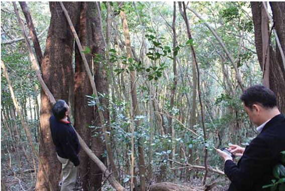 もう一人、紳士的と思える人が共助研のMORIさんである。昔の話で恐縮だが、この二人も入れて、大分県分母大野市犬飼町での「柴北川プロジェクト」の中で、ヤマザクラの大木を探しているシーンの写真が見つかった。2012(平成24)年の春の写真である。二人とも顔が見えないが、ヤマザクラの大木の幹の前がMAHAさん、右でGPSを確認しているのがMORIさんである。MORIさんは、現在の英彦山P.の中心メンバーの一人である。