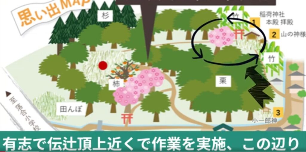 半年前頃、その山の頂上付近を探索する機会があった。すると、そこに「数本の栗の老木」、「ヤマザクラの大きな木1本」、「稲荷神社の鳥居と本殿、拝殿」を見つけた。思い出話と合致していたのでとても感動した。