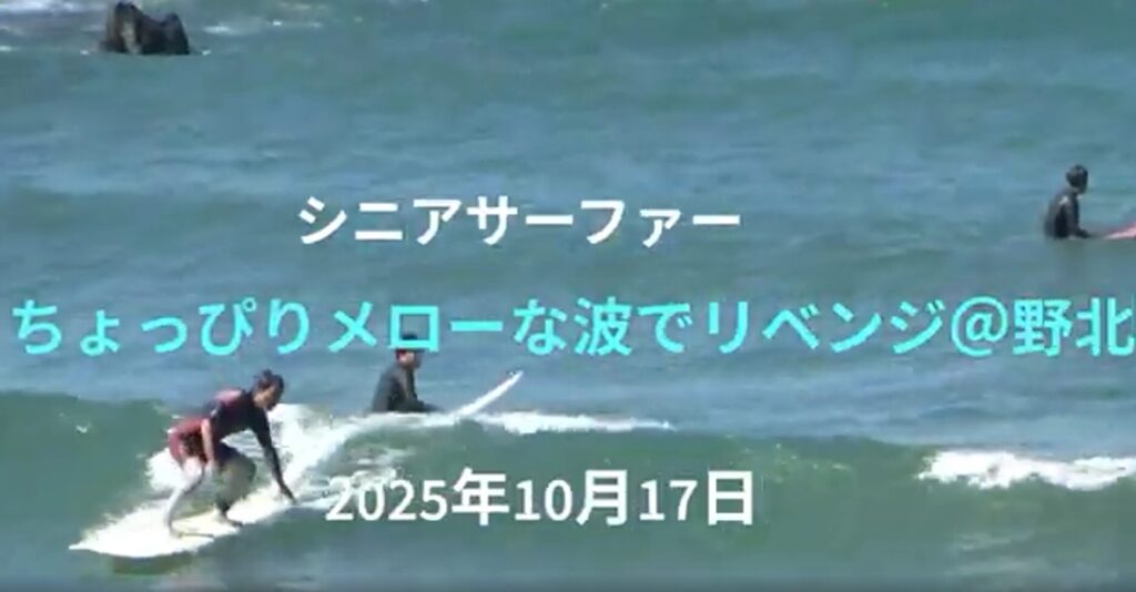 2025年10月13日、体力・気力は今一であったが、波の条件、撮影者確保(連れ合い)の2つの条件がそろった。体力については、今年の異常な暑さの影響か、胃の調子を悪くし、しかも、外耳炎・耳管狭窄症を患い、未だ回復の途上であった。これまでの夏は、波がなくても、一週間に一度は海に入り、パドリングの練習などをしていたが、今年は夕刻になっても海に入る気がしなかった(これは、暑さの他に年齢も影響してきたかもしれないが)。そのため、コロナで止めやプール通いを再開し、少しだけ体力は戻りつつあった。