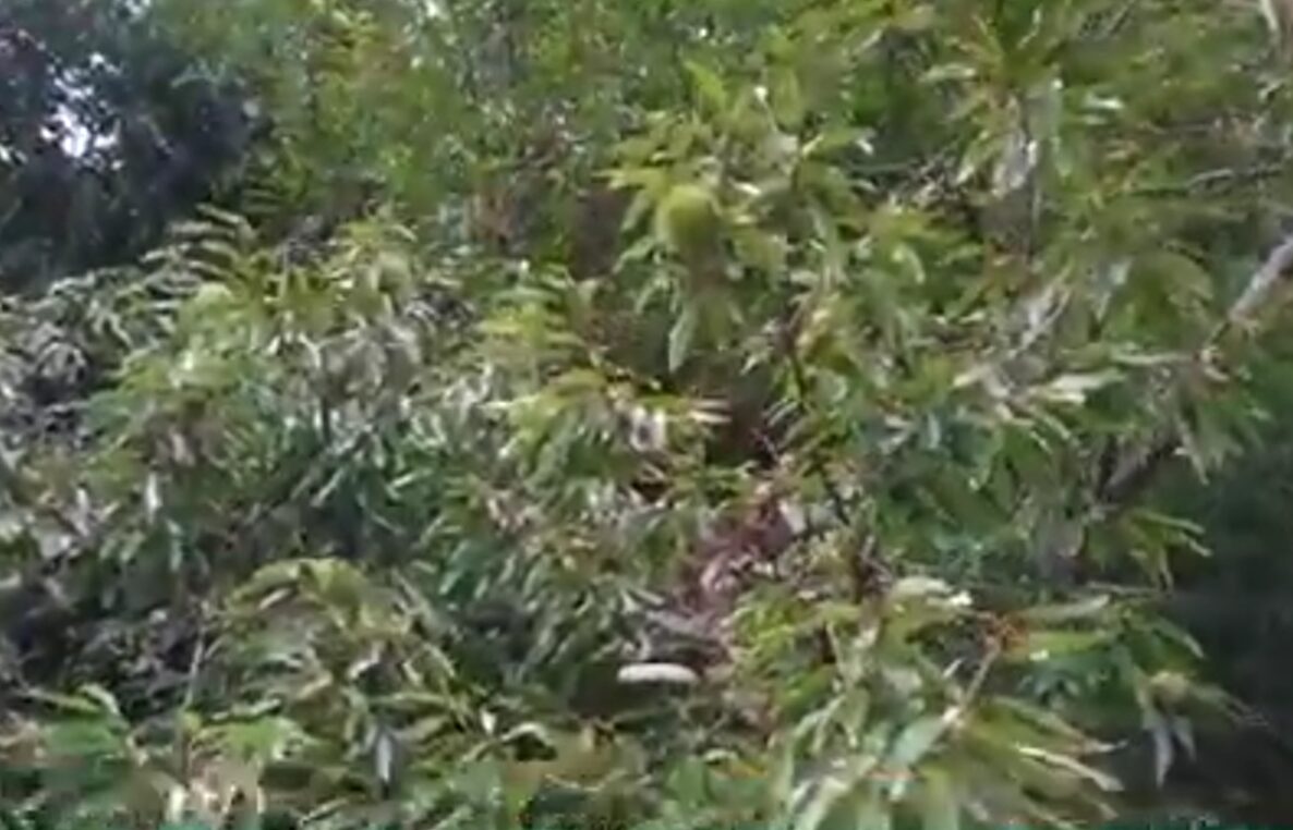 大きな栗の木で、下の落ちたものを拾うのなら少しは楽なのであるが、イノシシの縄張りとなっている場所なので、落ちた栗は、直ぐイノシシが食べてします。従って、昨年もそうだったが、イガ、それも青いイガ(膨らんでいて少し黄色くなっていれば良い)の段階で、竹の棒で叩き落したり、竹棒の先に残した小枝で挟みこんで採っている。