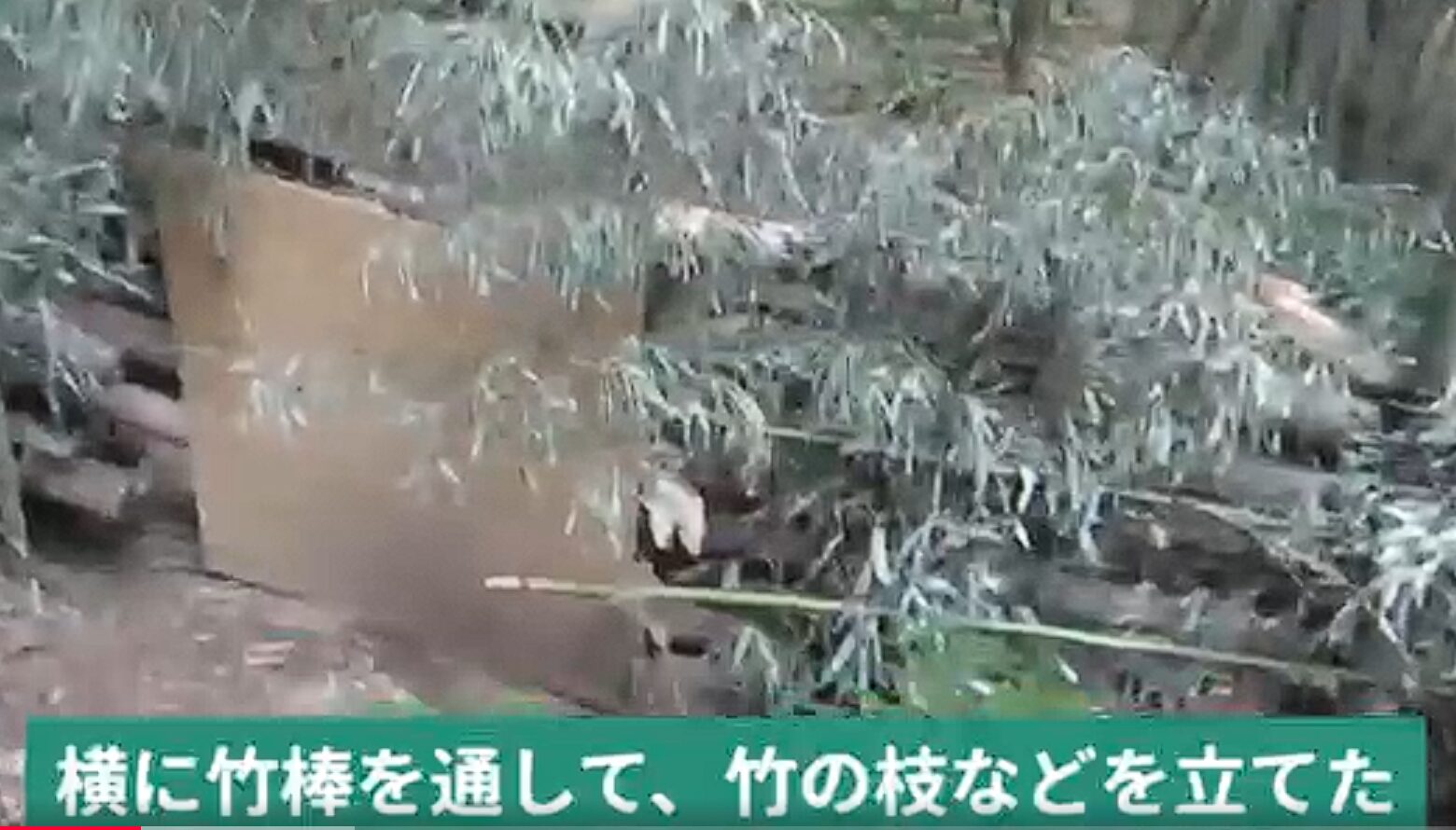 そこで、竹の杭を追加して、その間に竹を追加して高くするとともに、なるべく傾斜をなくし直立するように強化した。さらに、竹杭間の竹の棒を横に通して杭に固定し、竹の枝を縦に立てるようにした。高さが高く見えるし、隙間も少しは防げると考えた。