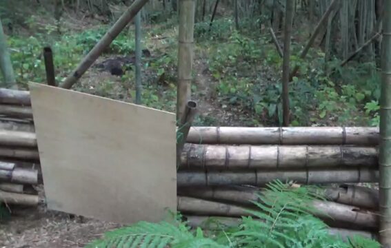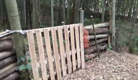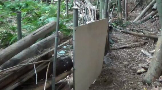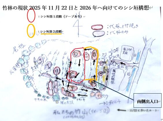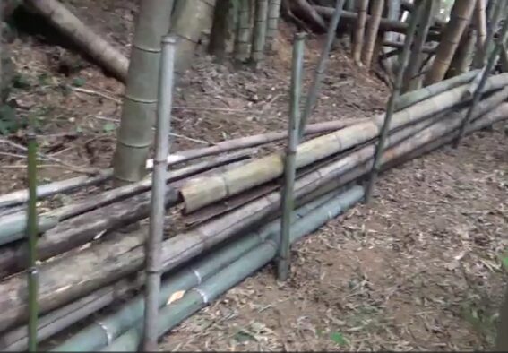 第2段階のエリアは、防護柵の材料が少なかった。このエリアは、竹炭。竹紛づくりで伐ったものをかなり片付けていたエリアだった。そこで、積む材料が少なくても良いように、竹の杭を狭い幅で打って、その間に竹を積むようにして作った。従って、柵は、高さ・幅・丈夫さなど不十分だが、とりあえず囲むことを優先した。