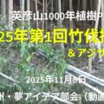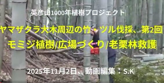 英彦山1000年植樹プロジェクトとして、伝辻と呼ばれている山の道路沿いにヤマザクラの苗木を植えている。その伝辻山の山頂付近にヤマザクラの大木を発見しており、道路沿いの植樹活動の番外編として、発見した大きなヤマザクラの周辺の竹を伐採し始めた。このヤマザクラは、稲荷神社の傍にあるので、仮称として「伝辻・稲荷ヤマザクラ」と呼び、その周辺の竹とさらに一段上った「老・栗の木林の平場」の竹も伐採している(栗の木を助けるため)。10月19日にその第1回を行ったが、天候などの影響もあり、作業目標を達成することができなかった。今回は、その第2回で、竹を伐り、広場を作るなどの活動を行った。