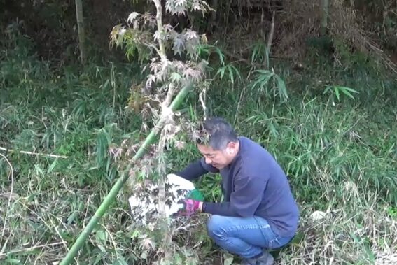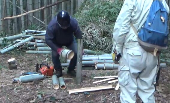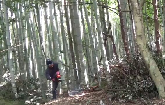 MIYAさんは、巧みにロープを使って竹を倒す方向を調整しながら、竹を伐っていき、女性二人は、太い枝切用の剪定ばさみで竹の枝を切って、片付けていった。