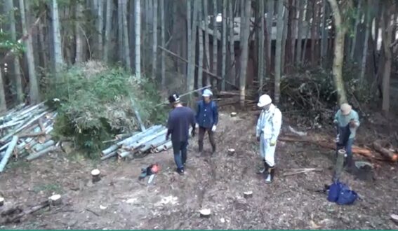 前回、ヤマザクラ大木周辺の竹やツルを伐った他、ヤマザクラ大木前の竹もHAMAさんが伐って、広場の形は整っていた。今回は、MIYAさんと女性二人がその広場の拡張を担当した。