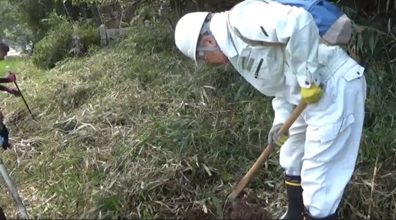 モミジ2本の植樹は、ヤマザクラ3本を植えている近くで行った。地盤が、メダケが繁茂していた場所であったので、掘ってみると予想よりかなり固かった。まずは、根っこが繁茂している箇所を鍬などで掘ると、濃い灰色に近い地盤が出てきた。地質の専門家ではないが、「阿蘇溶結凝灰岩」ではないかと思われる。いつか専門家に聞いてみたい。その固い地盤も少し掘って、植穴を作った。HAMAさんにも協力していただいた。