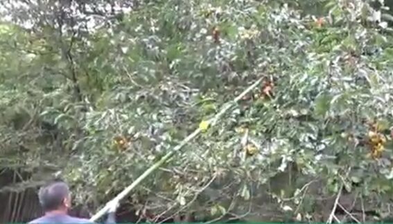 MIYAさんが、また遊びの技を使って、竹の棒の先端に切り口を作って、柿の枝を挟む道具を作ってくれた。お昼のデザート用に甘柿を頂いた。たくさん採って良いとのことであったので、お土産用にも頂いた。