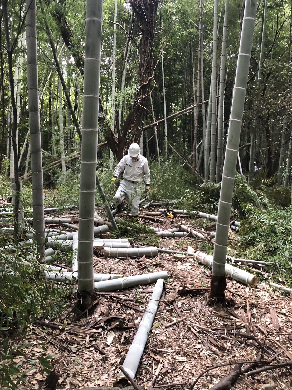 MIYAさんは、巧みにロープを使って竹を倒す方向を調整しながら、竹を伐っていき、女性二人は、太い枝切用の剪定ばさみで竹の枝を切って、片付けていった。